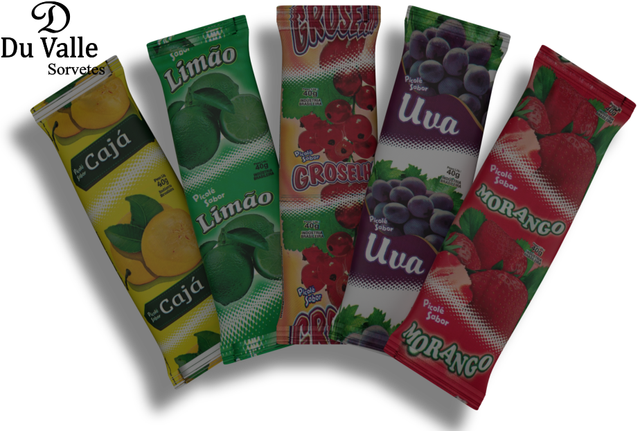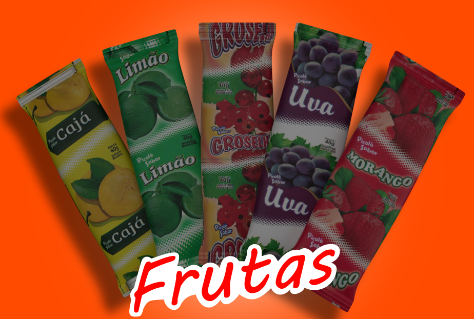 Picolés de frutas sabores: Abacaxi, Caja, Goiaba, Groselha, Limão, Maracuja, Morango e Uva.